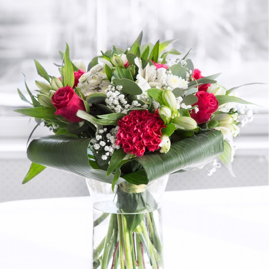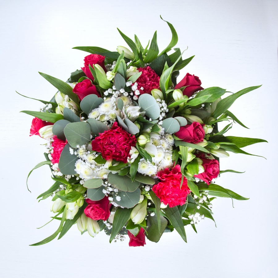Experience the enchanting beauty of our unique bouquet, meticulously crafted to stir your creativity and imagination. This arrangement showcases vibrant red roses and carnations, sweet white chrysanthemums, and delicate gypsophila, all harmoniously blended with white alstroemeria and lush aspidistra leaves.